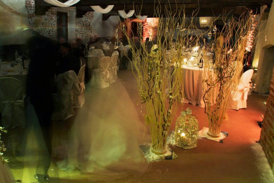 Dopo il rito religioso, la festa è iniziata nel sontuoso CastelloTapparelli D'Azeglio di Lagnasco, nella pianura a est di Saluzzo, un comune prettamente agricolo,dove lo straordinario complesso monumentale ed architettonico del Castello ha trasformato la serata in un luogo da sogno. Addobbi di veli,candelieri colmi di fresche rose e perle oro hanno creato un'atmosfera raffinata ed elegante mentre fuori iniziò a nevicare.