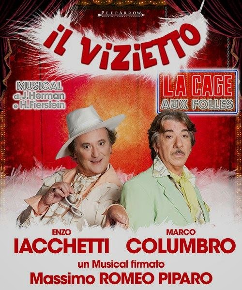 Il VIZIETTO, in primis, un film di Edouard Molinaro del 1978, adattamento cinematografico di una commedia di Jean Poiret messa in scena nel 1973 e replicata per cinque anni consecutivi al Palais-Royal di Parigi. Portato in scena per la prima volta nel 1983, il musical tratto dal celebre film con Ugo Tognazzi e Michel Serrault - racconta dell'amore ventennale tra Renato e Albin, una coppia omosessuale che gestisce un locale a Saint Tropez. Regista assoluto Massimo Romeo Piparo, come dichiarato, questa divertente commedia è ancora attualissima, affronta temi come l'omosessualità e le coppie di fatto in maniera schietta, chiara e divertente. Tra calze a rete e paillettes, l'amico Enzino Iacchetti ha fatto suo il personaggio della drag queen Zazà, alter ego di Albin, superlativo l'amico Marco Columbro nella parte di Renato. In scena ci sarà anche il ballerino e coreografo statunitense Russell Russell, che si esibirà insieme ad un corpo di ballo di quattordici elementi, tra cui vere drag queen. Tutti danzano sui tacchi a spillo coreografati da Bill Goodson e cantano con voci da soprano diretti dal Maestro Emanuele Friello.